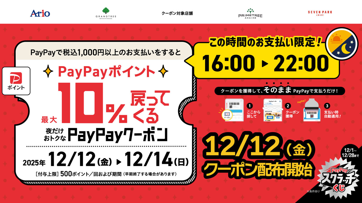 対象店舗にて16時~22時の時間にPayPayでお支払いすると最大10%PayPayポイントが戻ってくる!