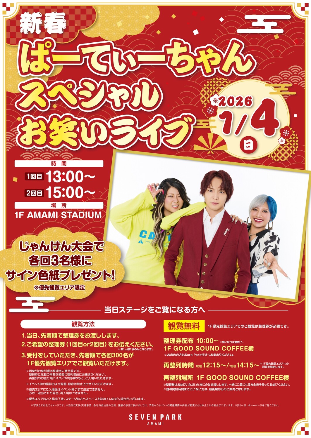 令和のパリピお笑いトリオ「ぱーてぃーちゃん」がセブンパーク天美に登場!新春の初笑い「ぱーてぃーちゃんスペシャルお笑いライブ」をお楽しみください!