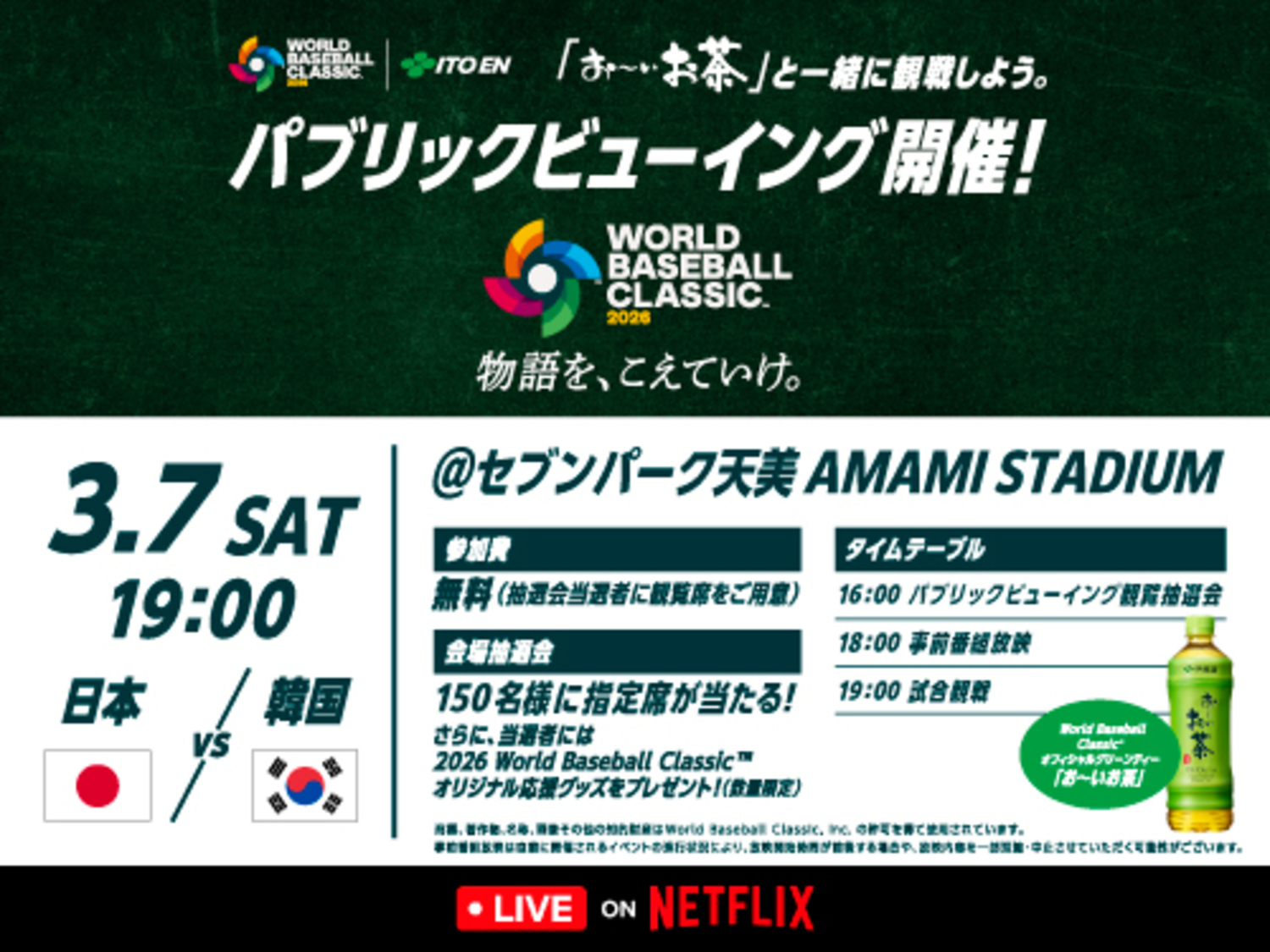 2026 World Baseball Classic™ のグローバルパートナーである伊藤園と、全試合をライブ配信する Netflix がタッグを組み、日本代表の熱戦を楽しむパブリックビューイングを開催します。