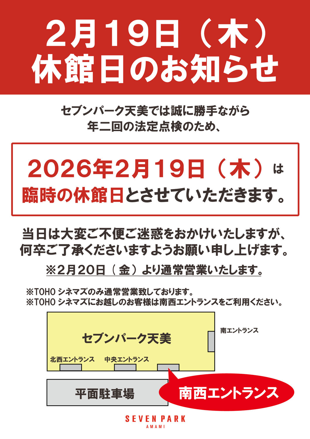 2026年2月19日(木)は臨時休業とさせていただきます。