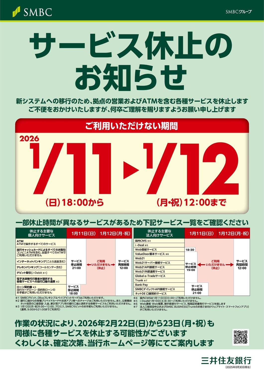 新システムへの移行のため、拠点の営業およびATMを含む各種サービスを休止します。