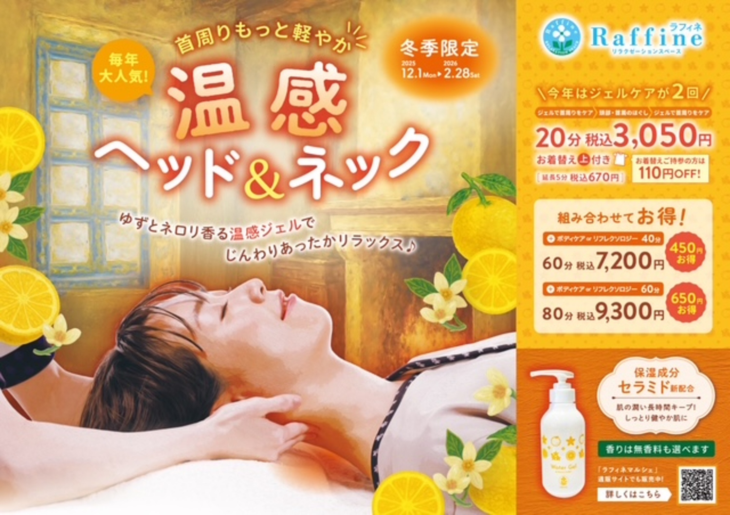 今年はジェルケア2回にパワーアップ!首まわりがよりほぐれ、ジェルの香りもいっそうお楽しみいただけます!