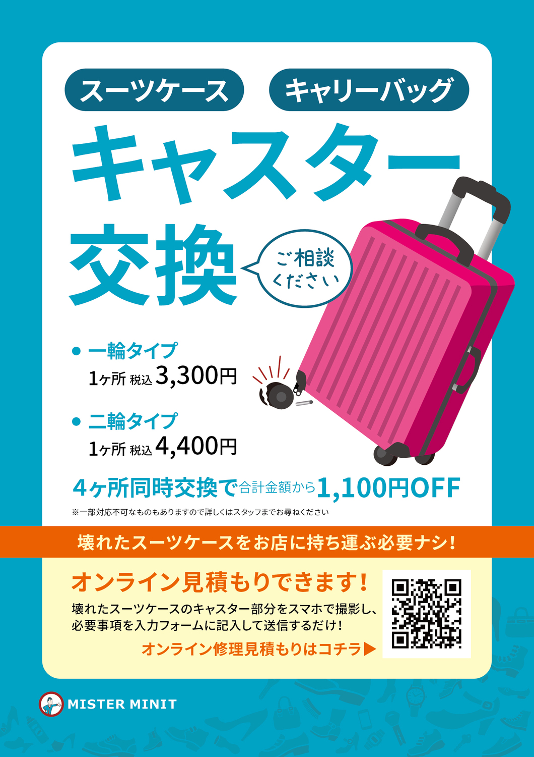 ミスターミニットではキャリーバッグのキャスター(車輪)の交換を